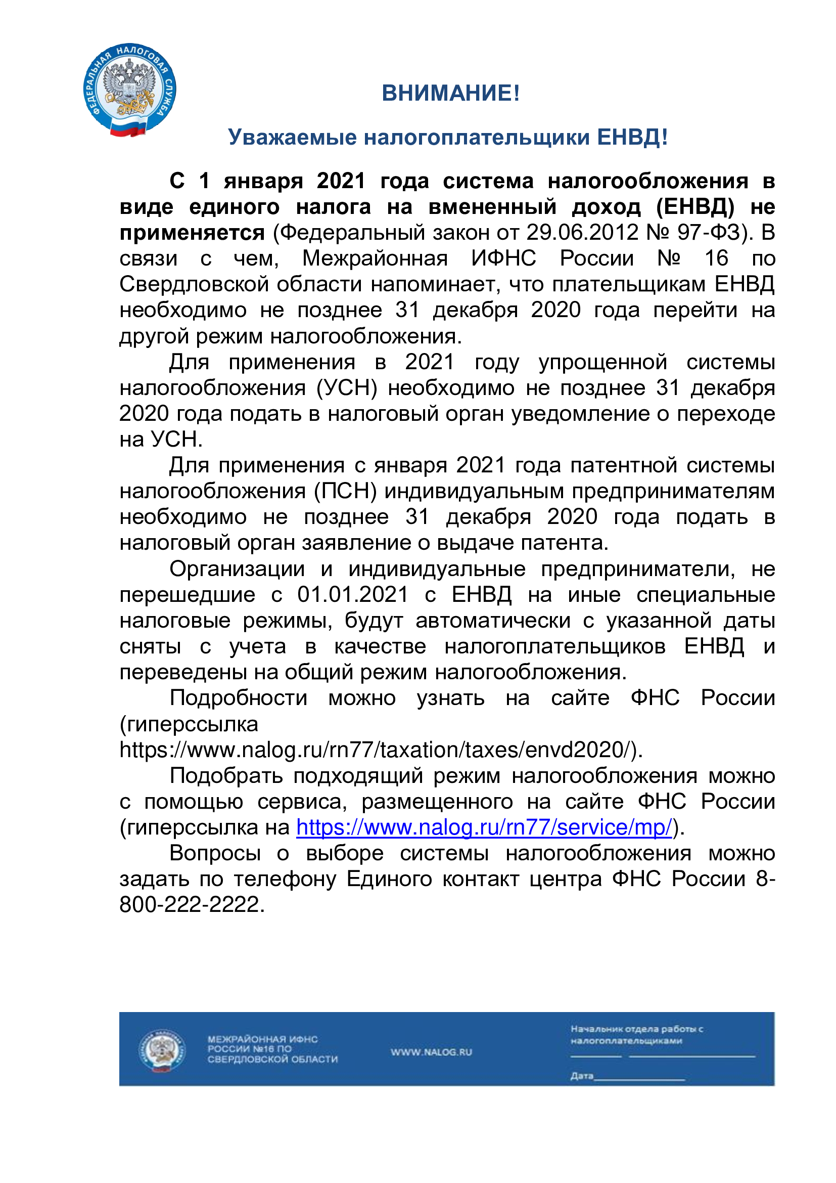 С 1 января 2021 года система налогообложения в виде единого налога на вмененный доход (ЕНВД) не применяется