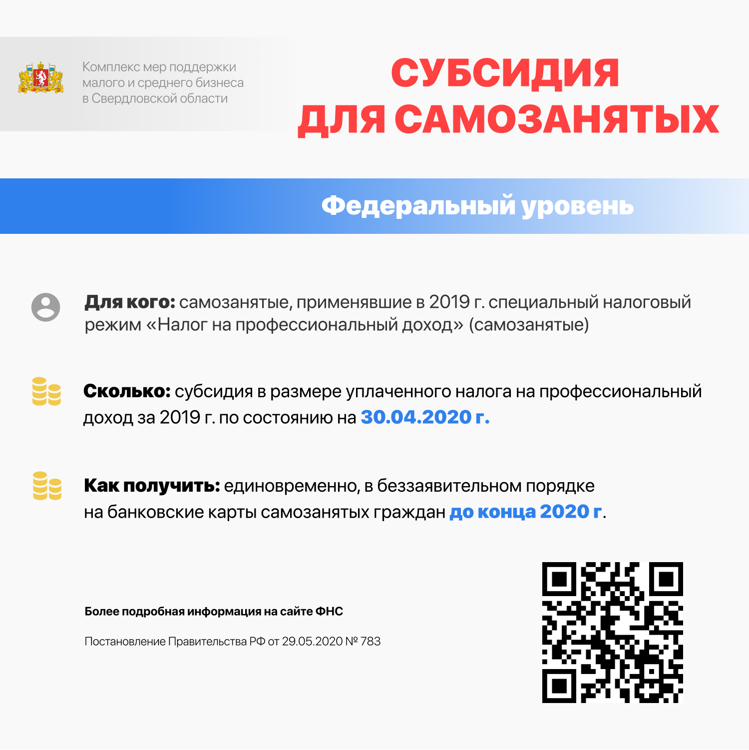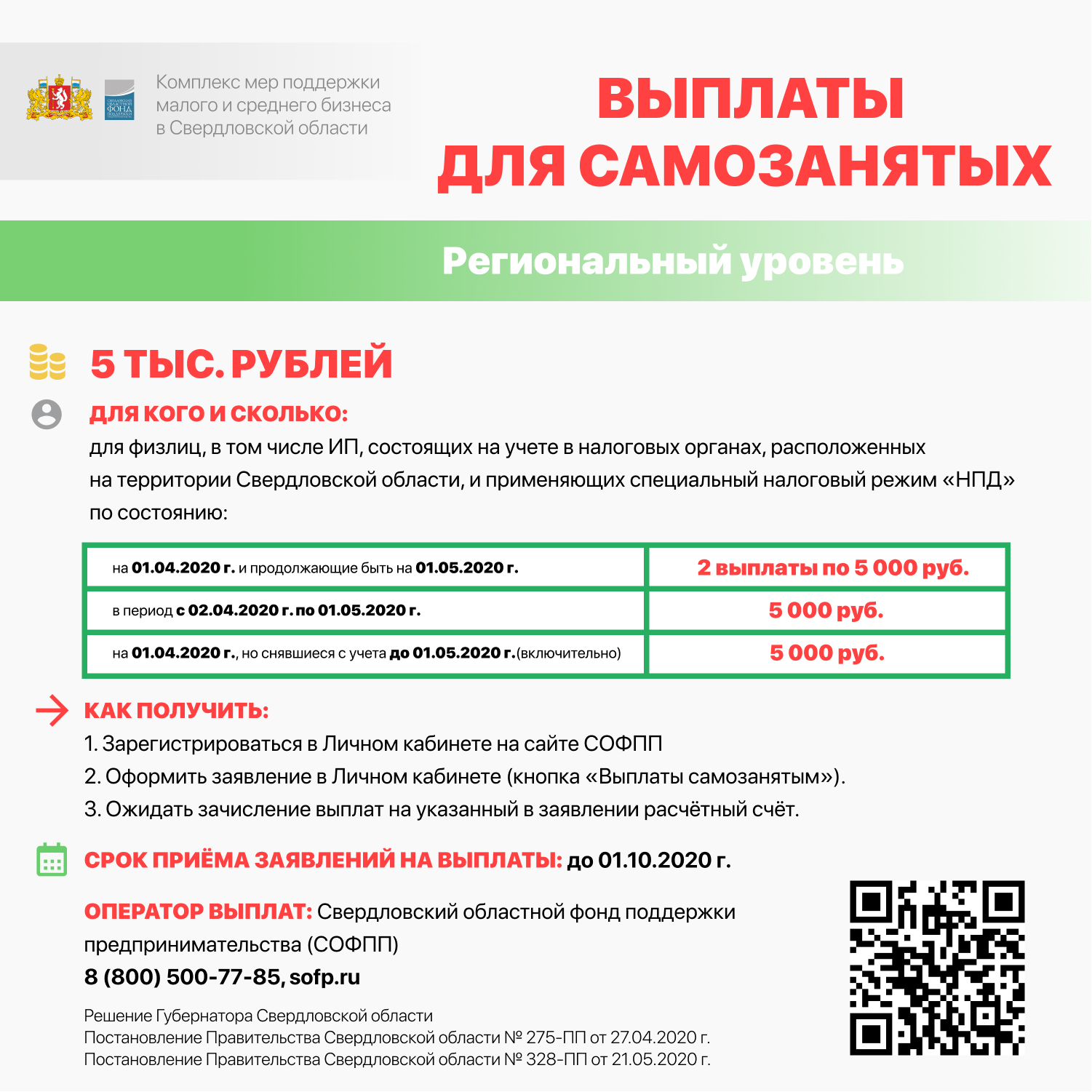 Данная мера поддержки рассчитана на самозанятых, состоящих на учете в налоговых органах, расположенных на территории Свердловской области, и применяющим специальный налоговый режим «Налог на профессиональный доход». Заявления на выплаты принимаются до 1 октября 2020 года.